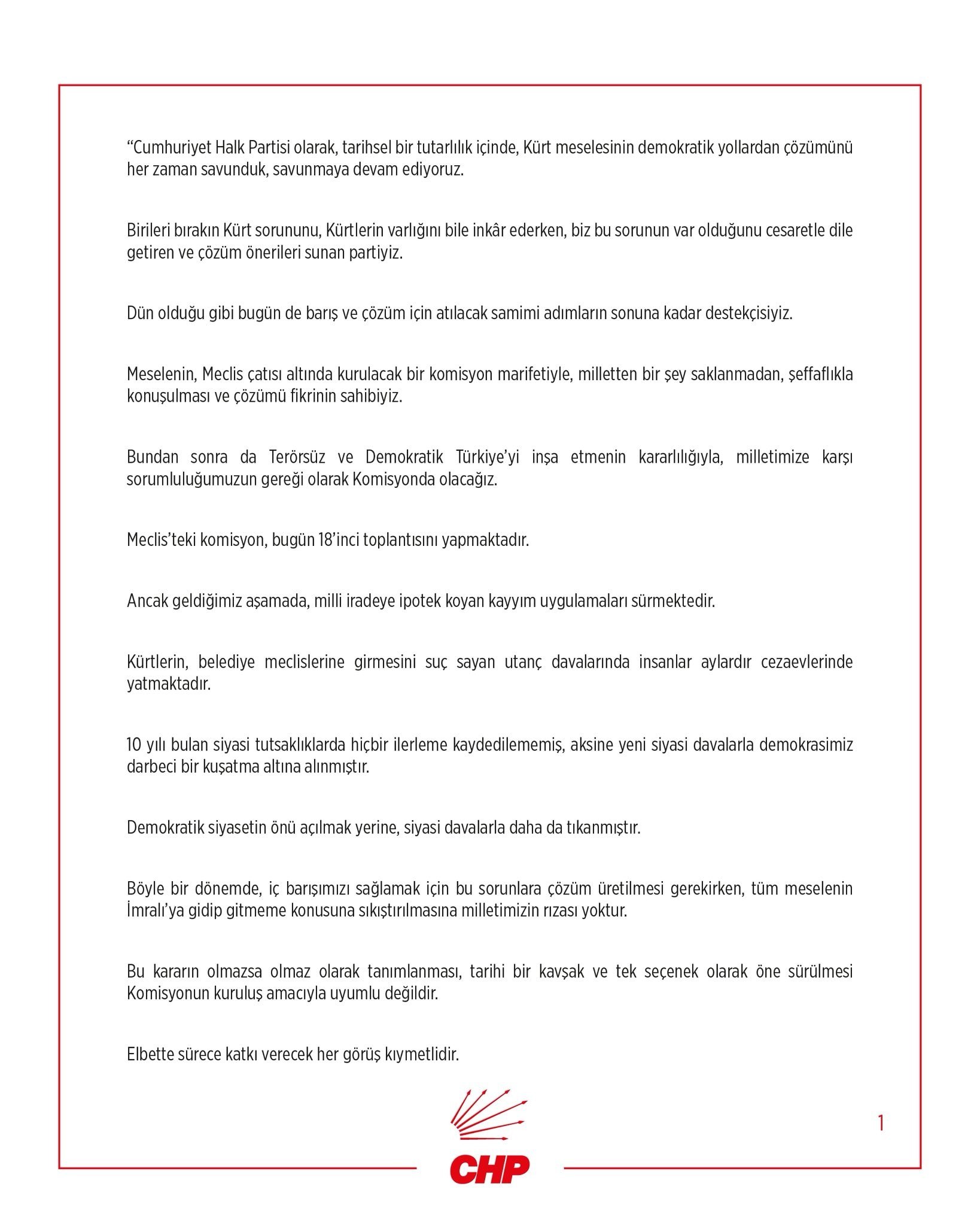CHP açıklamasında, Kürt sorununun TBMM çatısı altında, açık ve şeffaf bir biçimde ele alınması gerektiği vurgulanarak şu değerlendirmelere yer verildi: