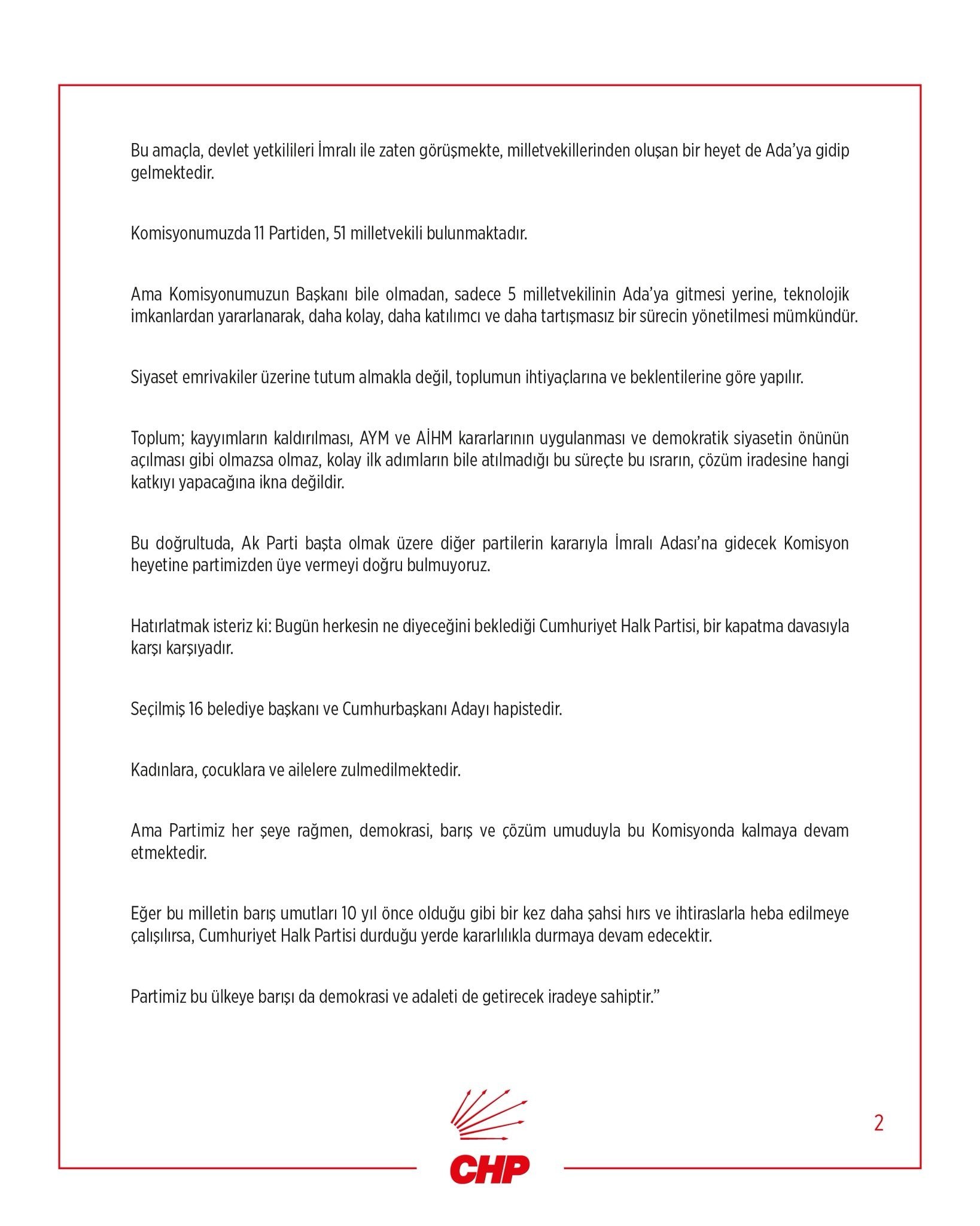 CHP, komisyonun kuruluş amacının geniş bir toplumsal barış tartışması yürütmek olduğunu ancak sürecin sadece bir ziyaret üzerinden şekillendirilmesinin doğru olmadığını belirtti.