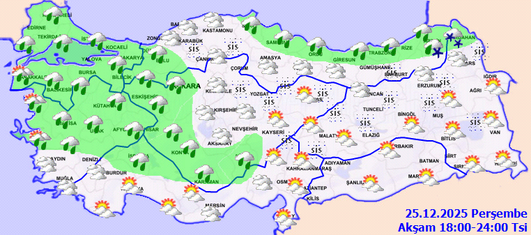 Türkiye genelinin parçalı, yer yer çok bulutlu, Marmara, Ege, Batı Akdeniz, İç Anadolu’nun güney ve batısı, Orta ve Doğu Karadeniz kıyıları, Zonguldak, Düzce, Bolu ve Sinop çevreleri ile Kastamonu’nun kıyı, Mersin’in batı kesimlerinin yağmur ve sağanak, Artvin ve Ardahan çevrelerinin karla karışık yağmur ve kar yağışlı geçeceği tahmin ediliyor.