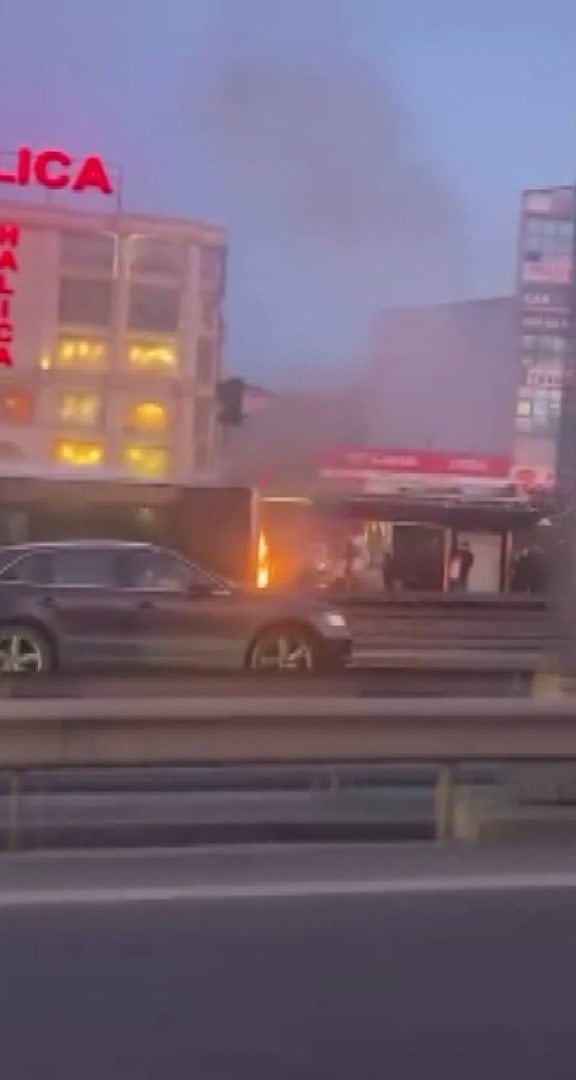 Metrobüsün motor kısmının alevli yanması cep telefonu kamerasına yansırken seferlerde aksama yaşanmadı.